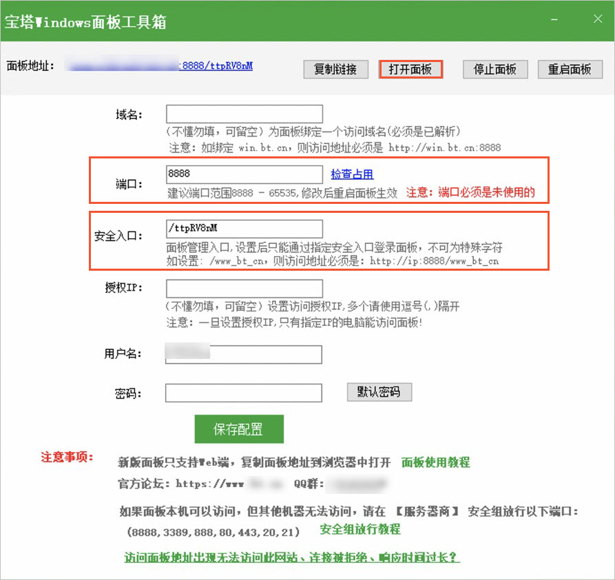 [安全入口]:如果宝塔面板开启了安全入口,则浏览器的访问地址必须加入[安全入口]地址,否则访问宝塔面板时会提示“404”错误。该参数的值为宝塔Windows面板工具箱页面的安全入口,以/ttpRV8nM为例。